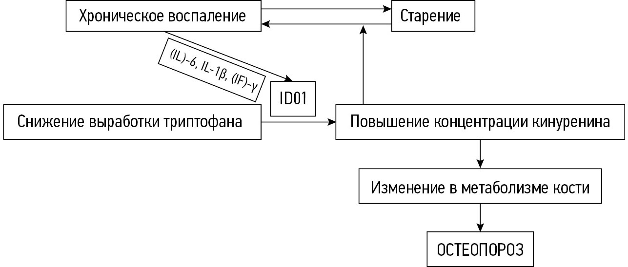 В ряде исследований, помимо доказанной роли воспалительных медиаторов в процессе старения, была освещена роль аномальной активации сигнальных путей, включая кинурениновый путь. Триптофан является ключевым питательным веществом, необходимым для образования витамина В3 (ниацина), который играет важную роль в энергетическом обмене и синтезе ДНК. Изменения в метаболизме триптофана могут существенно влиять на процессы старения и здоровье опорно-двигательной системы. Кинурениновый путь, ответственный за разложение триптофана, регулируется факторами воспаления. Из-за нарушений в кинурениновом пути, вызванных хроническим воспалением и изменениями в кишечной микробиоте, наблюдается увеличение концентрации токсичных метаболитов в крови, что может способствовать развитию указанных состояний. Из-за воспаления повышаются уровни ИЛ-6, ИЛ-1β и интерферона γ, индуцируя высокие уровни активности индоламин-2,3-диоксигеназы 1 (IDO1). В результате наблюдаются высокие концентрации кинуренина. Высокие уровни кинуренина, антраниловой кислоты и 3-гидроксикинуренина, низкие уровни хинолиновой кислоты, пиколиновой кислоты, 3-гидроксиантраниловой кислоты и NAD+ были связаны с изменениями в метаболизме костей, повышенным риском развития остеопороза и переломами. Эти изменения включали низкие уровни дифференцировки и функции остеобластов и высокие уровни адипогенеза костного мозга и резорбции кости остеокластами (рис. 3) [36].