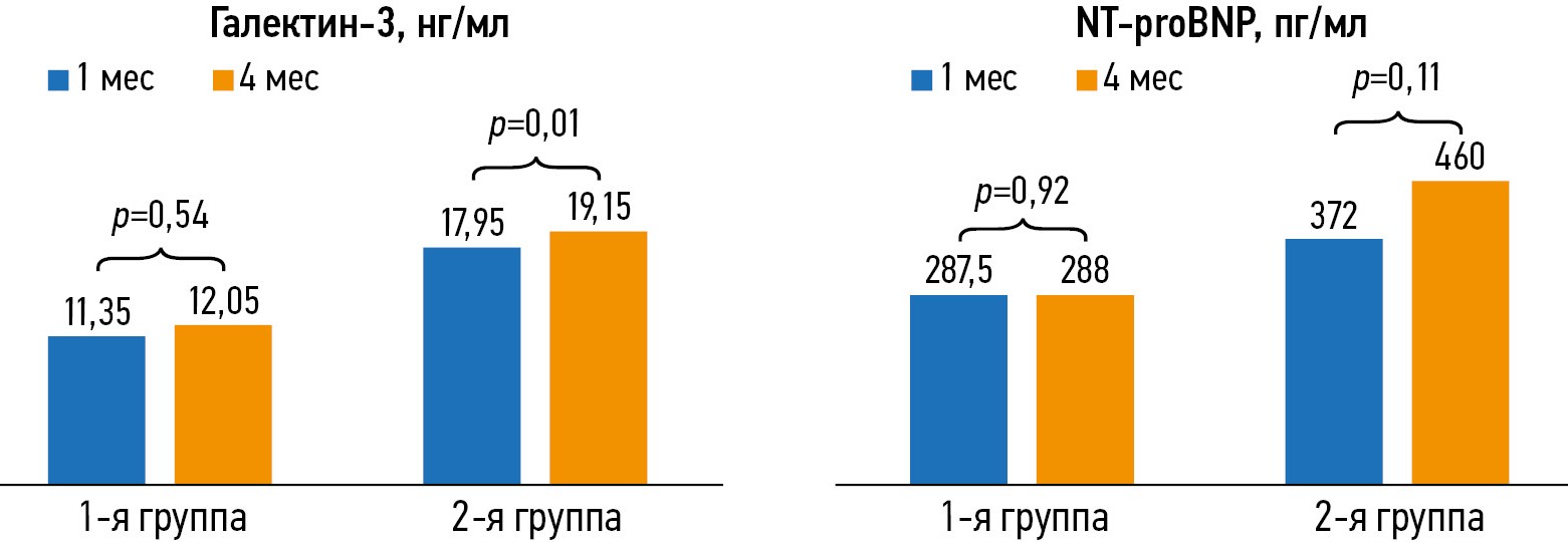 Концентрацию галектина-3 в плазме крови пациентов определяли с помощью набора для ИФА (Cloud-Clone Corp., США), чувствительность теста — 0,054 нг/мл. Уровни NT-proBNP в плазме крови пациентов измеряли с помощью набора для ИФА (Guangzhou Wondfo Biotech, Китай), чувствительность — 5,0 пг/мл.