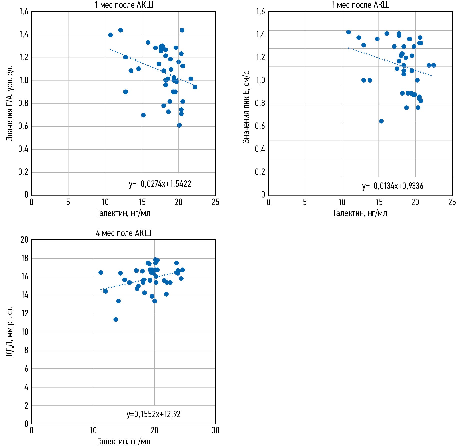 Рис. 2. Корреляционный анализ между величиной галектина-3 и ЭхоКГ-показателями у пациентов группы затяжного восстановления через 1 и 4 мес. после аортокоронарного шунтирования. КДД — конечно-диастолическое давление, АКШ — аортокоронарное шунтирование.