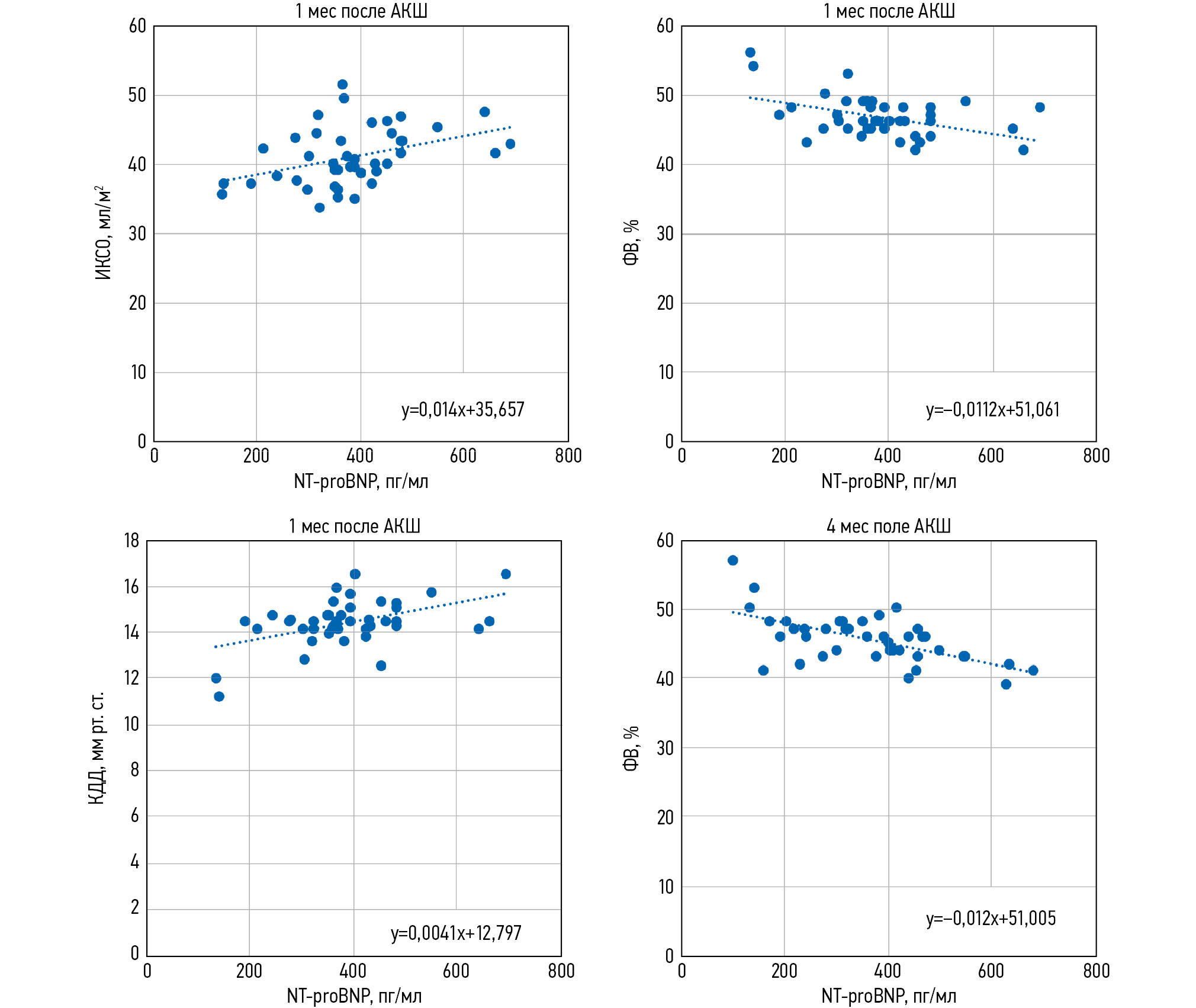 Fig. 3. Correlation analysis between the NT-proBNP 3 value and EchoCG parameters in patients in the prolonged recovery group 1 and 4 months after coronary artery bypass grafting. ИКСО — index of the final systolic volume, КДД — end-diastolic pressure, ФВ — ejection fraction, АКШ — coronary artery bypass grafting.