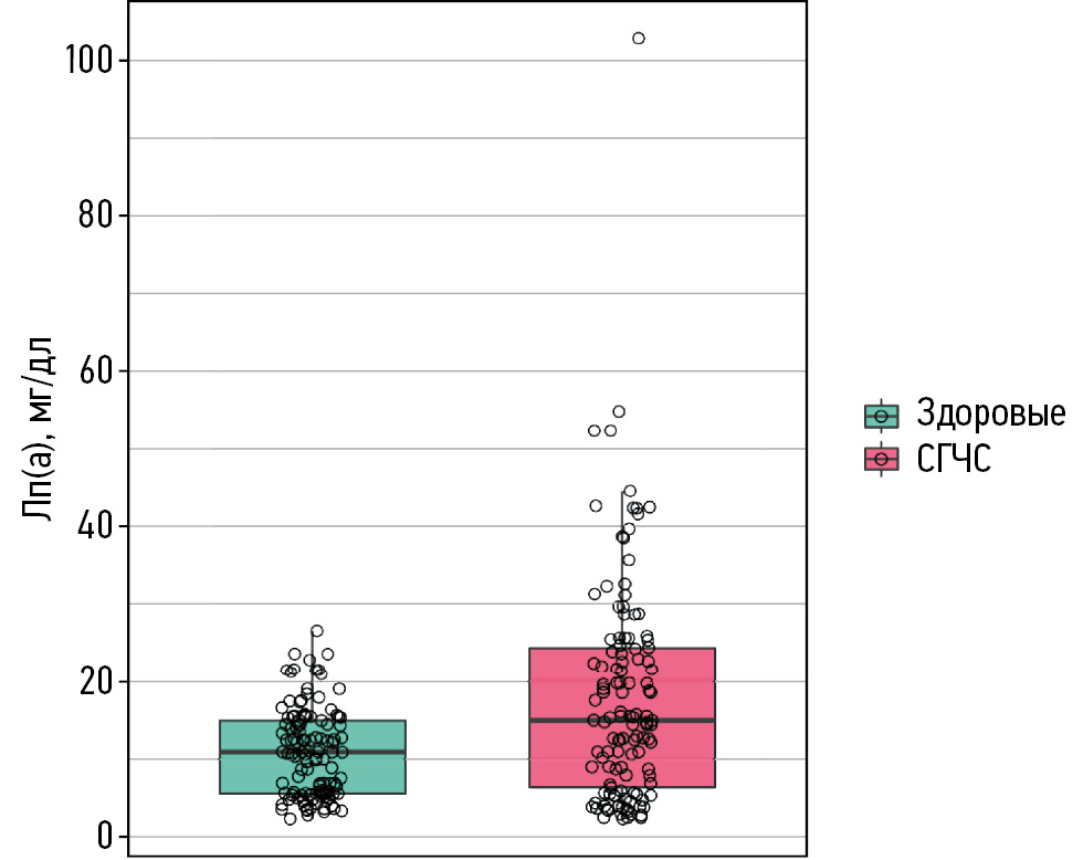 В настоящем исследовании отмечено статистически значимое повышение Лп(а) у пациентов с СГХС: 14,8 (6,3–24,3) мг/дл по сравнению с детьми контрольной группы — 10,8 (5,5–14,8) мг/дл, p=0,0002 (рис. 1).