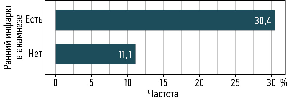 Учитывая, что уровень Лп(а) является генетически обу-словленным и полностью экспрессируется к первому году жизни человека, а также представленную в литературе связь высокого уровня Лп(а) с риском ранних сердечно-сосудистых событий среди членов семьи [7], мы провели подробный анализ отягощённой наследственности по сердечно-сосудистой патологии у родителей пробандов в зависимости от концентрации Лп(а) их детей. Особый акцент уделяли ОКС, а также возрасту его дебюта. Из 122 родителей у 23 (18,9%) был зарегистрирован ОКС в возрасте до 40 лет. Уровень Лп(а) >30 мг/дл среди детей этих родителей был выявлен у 7 детей (из 23), что составило 30,4% (рис. 2). При этом среди родителей, не имеющих в анамнезе ОКС до 40 лет, количество детей с повышенным уровнем Лп(а) составило 11 (из 99) — 11,1%. Статистический анализ показал, что шансы выявления уровня Лп(а) >30 мг/дл у детей с СГХС при наличии отягощённого семейного анамнеза раннего ОКС среди родителей были выше в среднем в 3,5 раза (95% ДИ: 1,14, 10,33; p=0,0239).