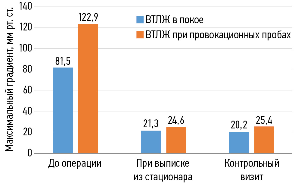 Максимальный градиент в ВТЛЖ до операции составил 81,5 мм рт. ст., после провокационных проб 122,9 мм рт. ст. При ЭхоКГ-исследовании при выписке из стационара в сравнении с исходными данными установлено достоверное снижение максимального градиента давления в ВТЛЖ после ССА: 81,5 и 21,3 мм рт. ст. соответственно (р=0,000001). Такая тенденция сохранилась и при контрольном визите, проведённом всем пациентам в феврале 2024 г. (срок от оперативного вмешательства составил от 3 до 18 мес.) (рис. 1).
