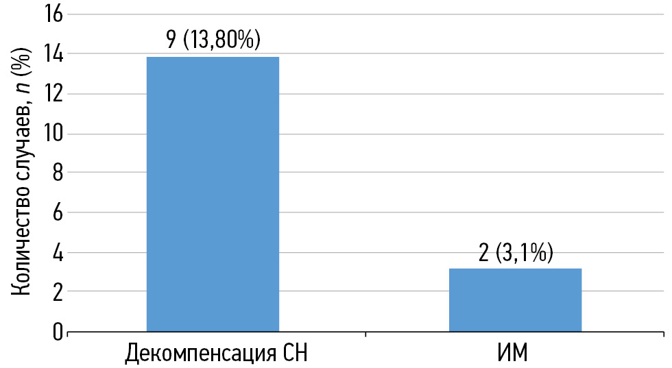 Большие сердечно-сосудистые события в течение года после ССА возникли у 11 (16,9%) пациентов, из них 9 (13,8%) случаев декомпенсации СН, 2 (3,1%) случая инфаркта миокарда (рис. 2 и 3).