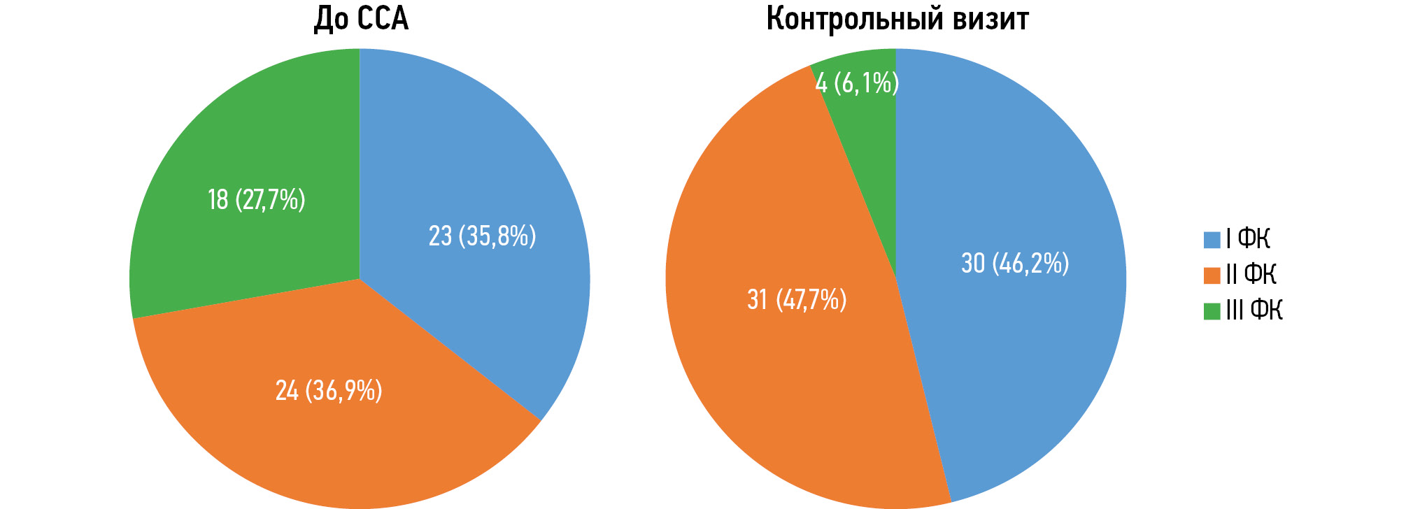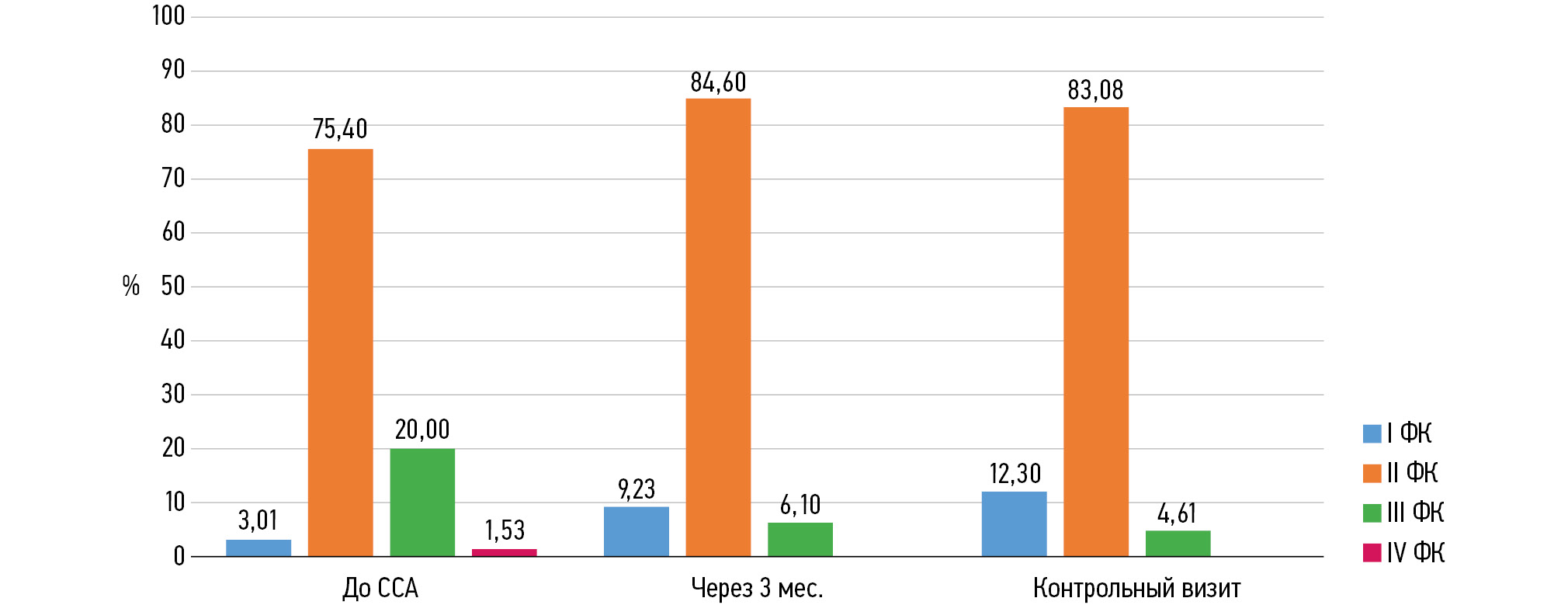 Сравнение клинического статуса до ССА и состояния пациентов при выписке показало достоверное снижение ФК СН: большинство прооперированных пациентов — 55 (84,6%) — при выписке из стационара имели II ФК СН. Только у 3 (4,61%) пациентов сохранился при выписке исходный III ФК СН (р=0,0009). Пациентов с IV ФК СН на контрольном визите не отмечено (рис. 4).