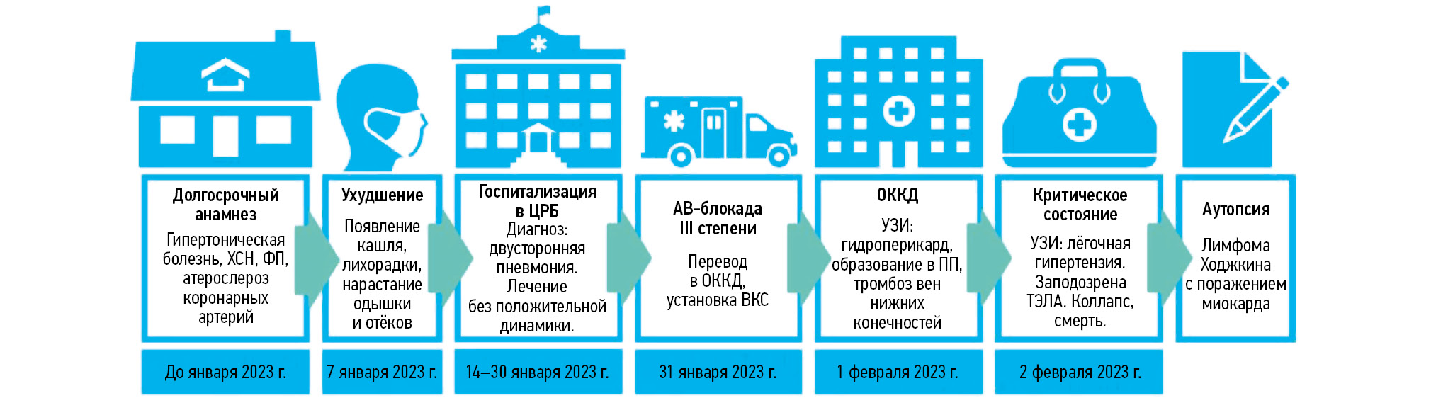 Рис. 1. Временная шкала. ХСН — хроническая сердечная недостаточность, ФП — фибрилляция предсердий, ЦРБ — Центральная районная больница, АВ-блокада — атриовентрикулярная блокада, ОККД — Областной клинический кардиологический диспансер, УЗИ — ультразвуковое исследование, ПП — правое предсердие, ТЭЛА — тромбоэмболия лёгочной артерии.
