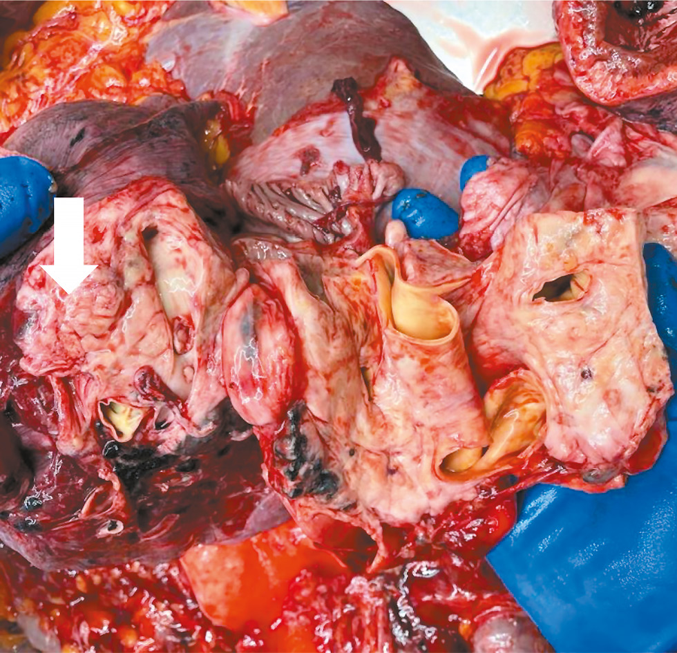 Рис. 6. В области корней лёгких и сосудистого пучка основания сердца диффузный опухолевый рост.