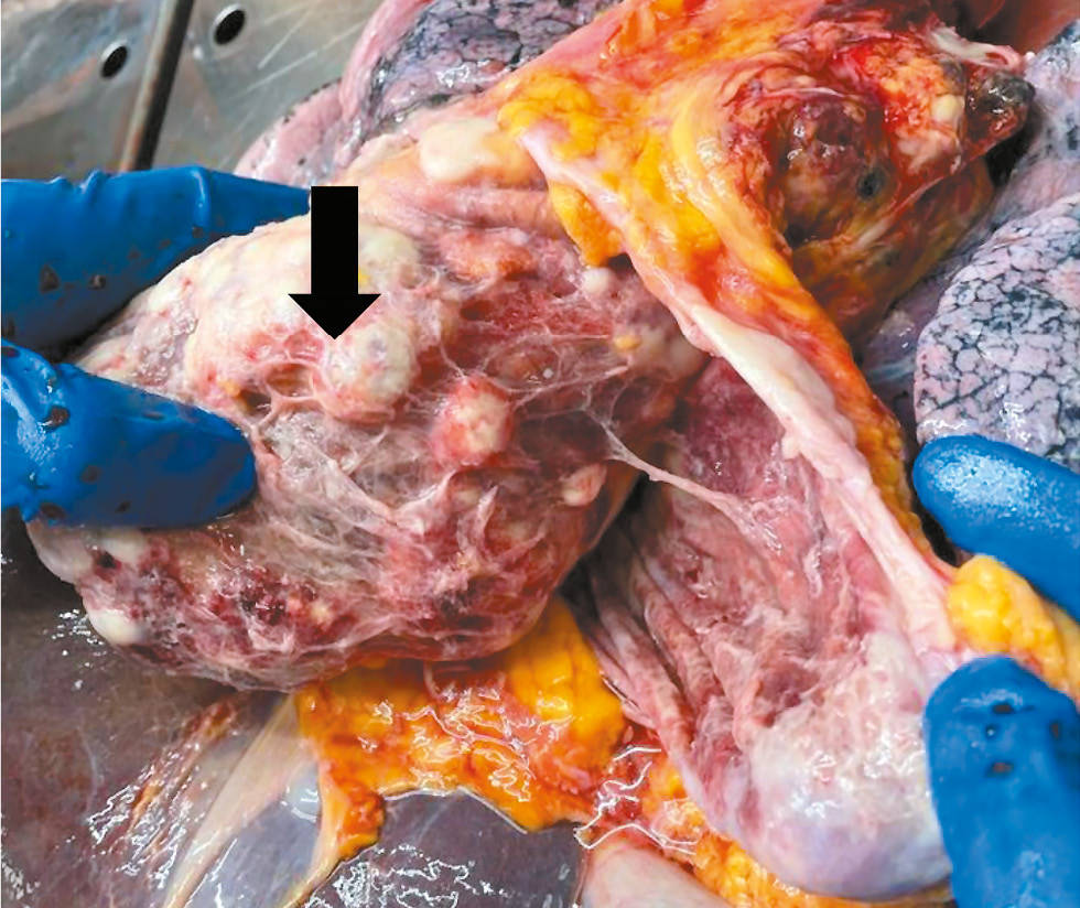 Fig. 7. Tumor growth in the heart. Fibrinous pericarditis.