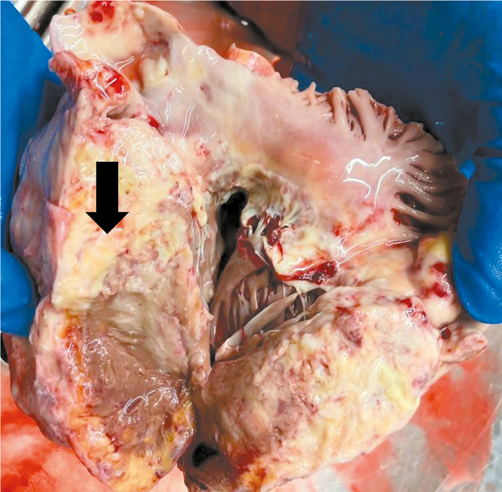Рис. 8. Миокард правого желудочка на разрезе с диффузным опухолевым ростом.