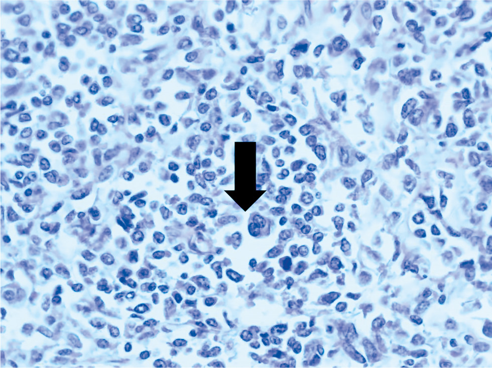 Рис. 9. Клетка Рида–Березовского–Штернберга (указана стрелкой). Микропрепарат (окраска гемотоксилин-эозином, ×200).