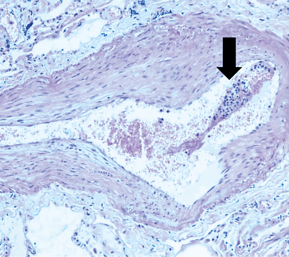 Рис. 10. Опухолевые клетки в составе тромбоэмболов в лёгочных артериях (указаны стрелкой). Микропрепарат (окраска гемотоксилин-эозином, ×100).