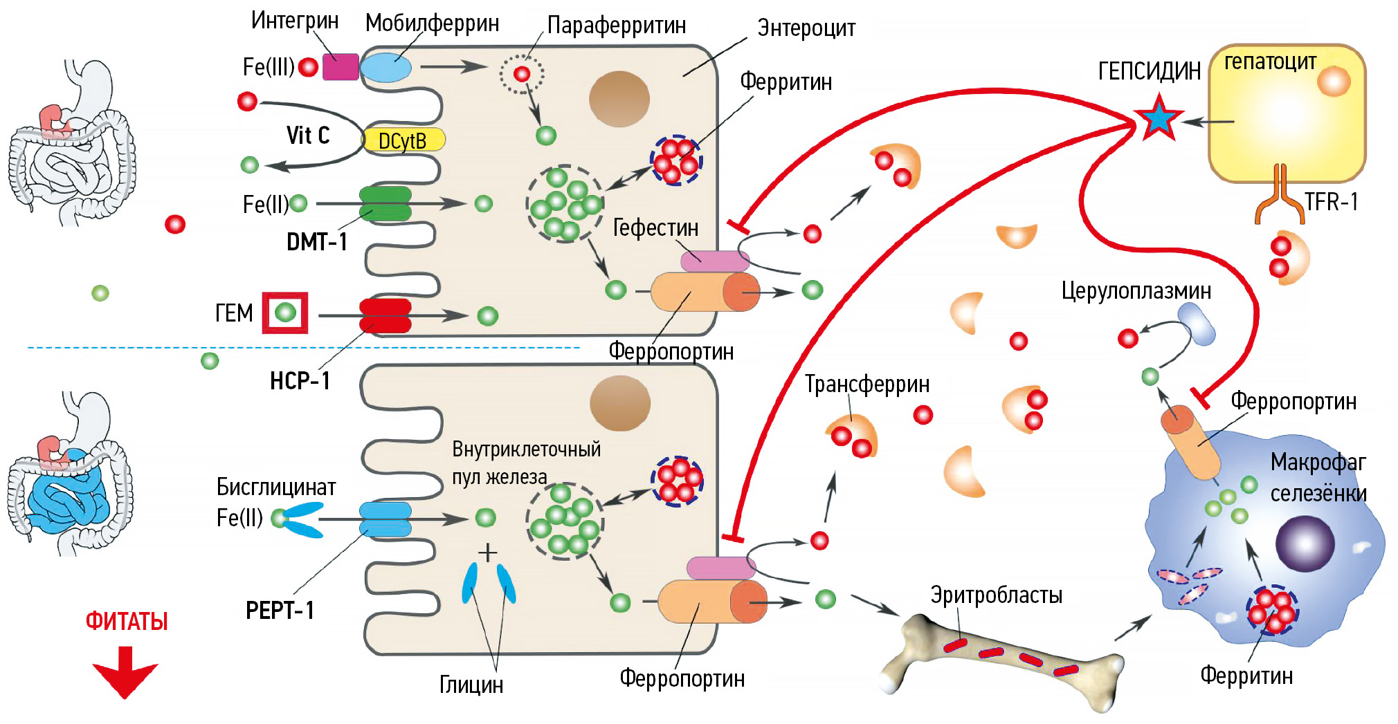 Бисглицинат железа может всасываться двумя путями: небольшое количество — через рецепторы DMT-1 (находятся на дуоденальных ворсинках) и основная часть — через рецепторы PEPT-1 (локализуются на протяжении всего гастроинтестинального тракта) [8]. Такая особенность бисглицината существенно повышает переносимость и уровень абсорбции железа. Подробнее преимущества бисглицината железа предоставлены на рис. 1.