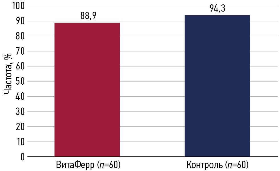 При оценке частоты возникновения НЯ была выявлена статистически значимая межгрупповая разница по общему числу НЯ, которое в группе БАД ВитаФерр составило 16 (26,7%), в контрольной группе — 37 (61,7%) (р <0,001). При этом металлический привкус во рту в контрольной группе возникал в 4 раза чаще — в 45% против 11,7% в группе БАД ВитаФерр (р <0,001), вздутие живота в контрольной группе отмечалось в 2,4 раза чаще — в 56,7% против 23,3% в группе БАД ВитаФерр (р <0,001), окрашивание кала в чёрный цвет в контрольной группе возникало в 4,7 раза чаще — в 23,3% против 5% в группе БАД ВитаФерр (р=0,007).