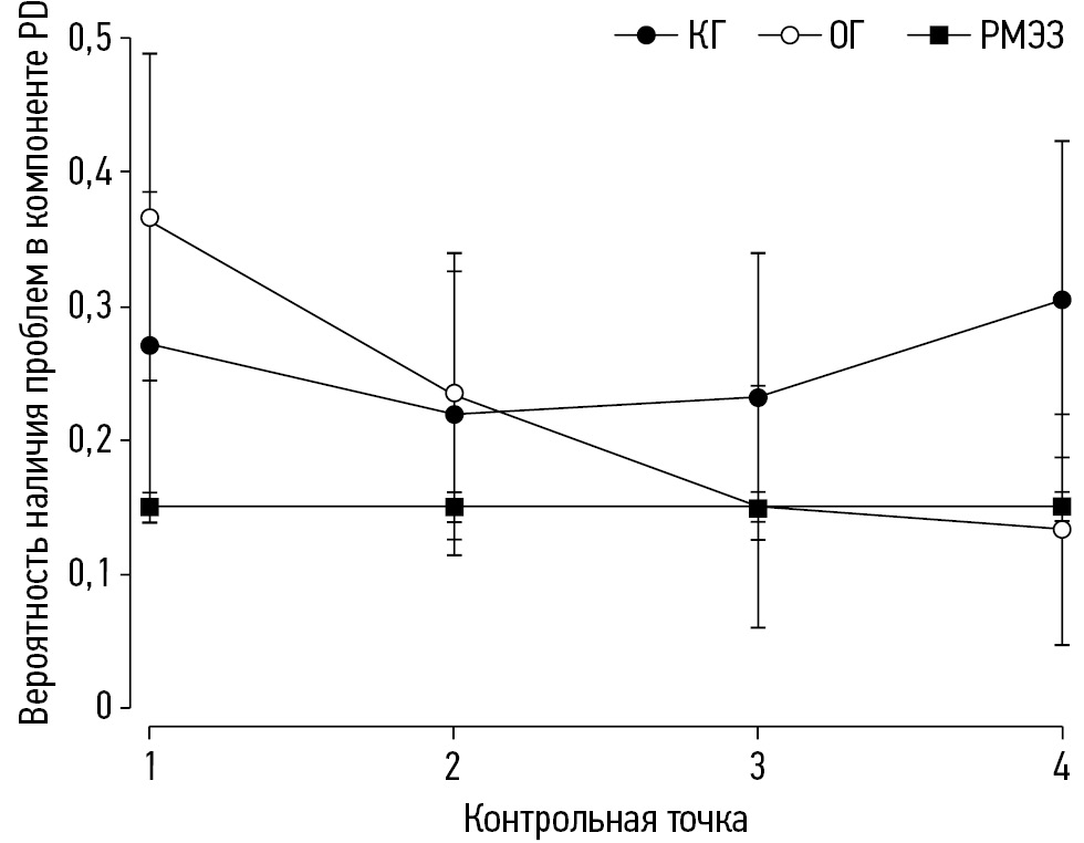 РМЭЗ изначально имеет значительно более низкую вероятность боли/дискомфорта по сравнению с КГ и ОГ (≈15,0%, p=0,012). КГ и ОГ схожи по уровню боли/дискомфорта в начале исследования (p=0,265). Далее наблюдается снижение уровня проблем с болью/дискомфортом в КГ к КТ2 (22,0%) и КТ3 (23,3%) с последующим возрастанием к КТ4 (30,5%). В ОГ вероятность боли снижается во времени (с 36,7% в КТ1 до 13,3% к КТ4), что говорит о позитивном эффекте вмешательства.