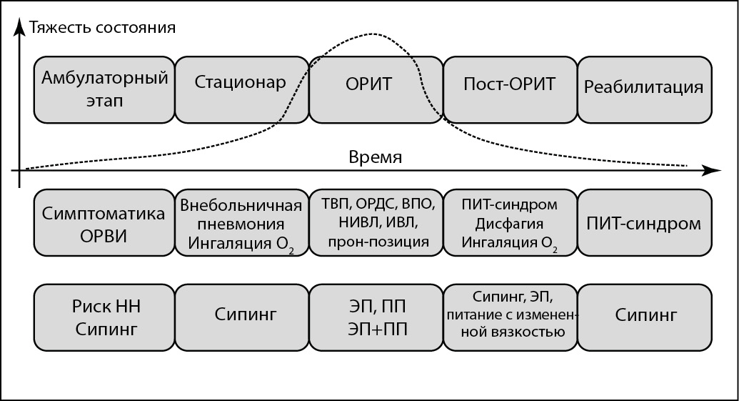 На рис. 1 схематично представлены варианты течения COVID-19 при благоприятном исходе, виды респираторной терапии в зависимости от тяжести состояния больного, а также НП на этапах лечения.