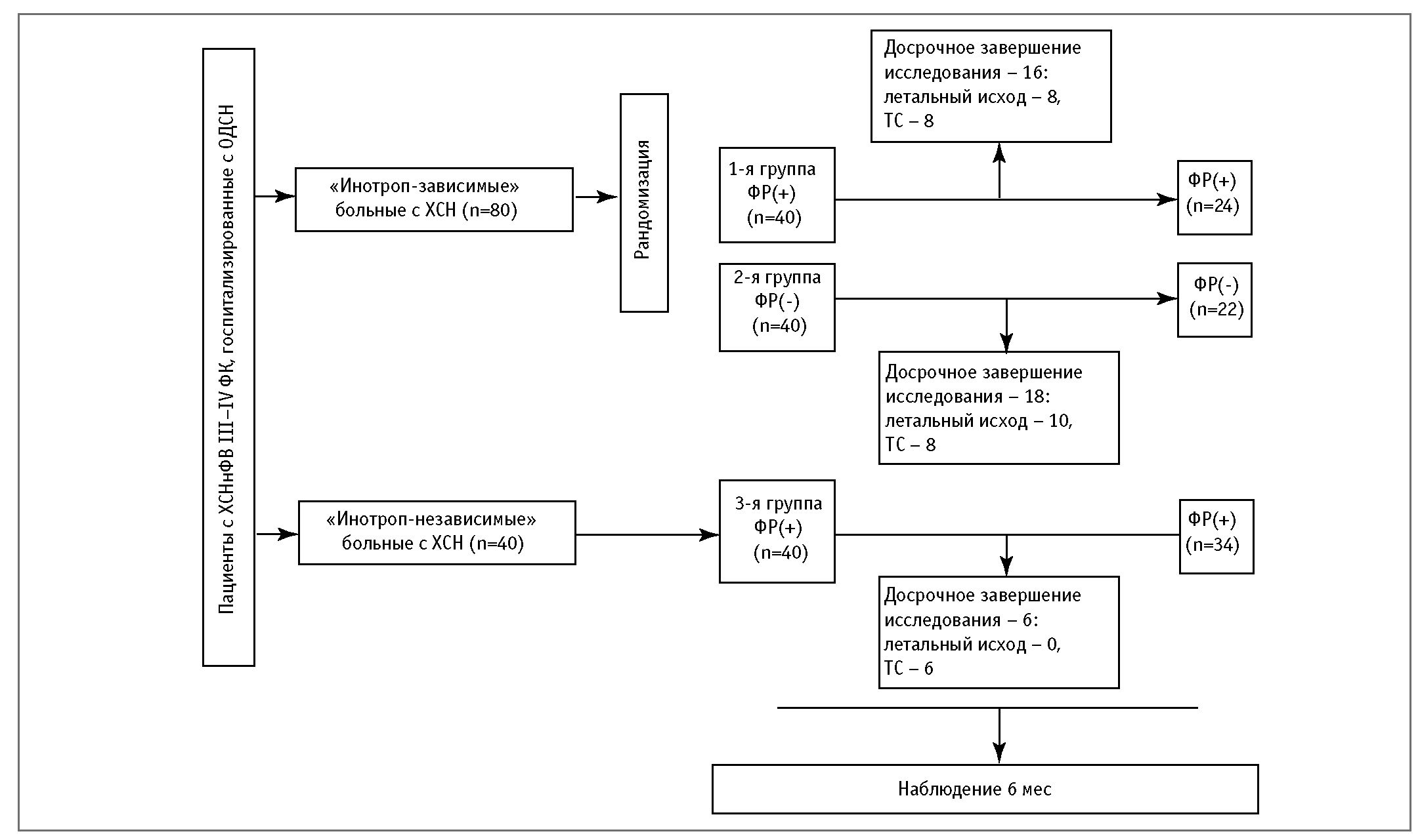Таким образом, предположение о взаимоотягощающем негативном влиянии на сердечно-сосудистую систему инотропных препаратов и активации СНС на пике ФН до настоящего времени не позволило включить в рекомендации использование ФТ у «инотроп-зависимых» больных с ХСН III–IV ФК.