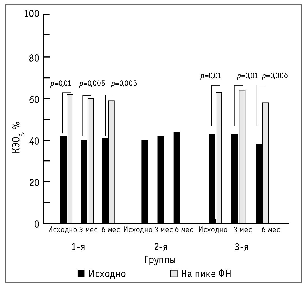 Проведенные ранее исследования описывают повышение КЭО2 в покое у больных с ХСН III и IV ФК без длительной инотропной поддержки до 39±9 и 48±10% соответственно, а на пике ФН – до 71±5% при III ФК и 75±8% – при IV ФК [8]. Нами получены сопоставимые с этим исследованием данные: у пациентов всех 3 групп на протяжении всего исследования КЭО2 был повышен в покое до 37–42% и нарастал на пике ФН, не превышая значений, полученных в исследовании, проведенном K. Weber и соавт. (1982 г.) [8].