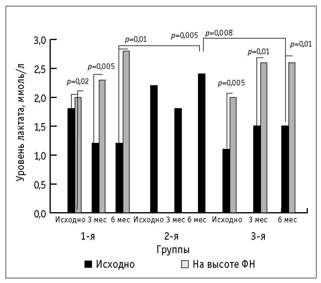 Известно, что при выполнении ФН транзиторное повышение уровня лактата крови до 5–6 ммоль/л не приводит к патологическим изменениям [17]. В проведенном нами исследовании в группах тренирующихся пациентов на пике ФН отмечалось сопоставимое значимое нарастание среднего уровня лактата крови, составлявшее <3 ммоль/л как исходно, так и на 3 и 6-м месяцах наблюдения, в большинстве случаев не сопровож- давшееся развитием ассоциированного с ФТ лактат-ацидоза. Эти изменения, с одной стороны, свидетельствуют в пользу преимущественно аэробного характера выполняемой пациента- ми ФН, а с другой стороны, подтверждают ее безопасность.