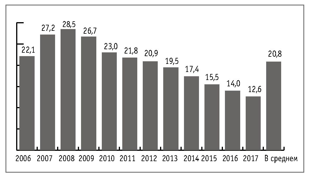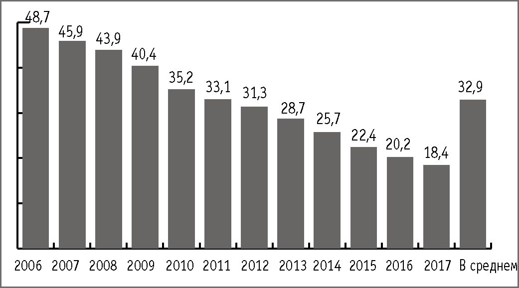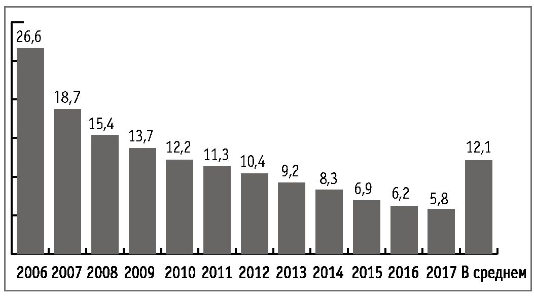 Рис. 1. Уровень первичной инвалидности вследствие ИБС в РФ в динамике за 2006–2017 гг. (на 10 тыс. взрослого населения).