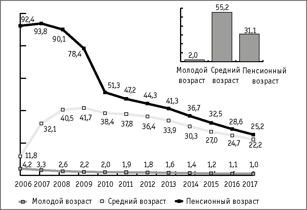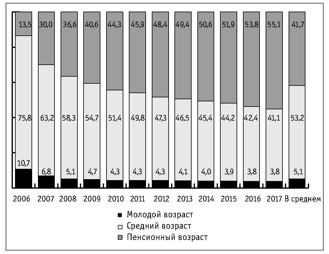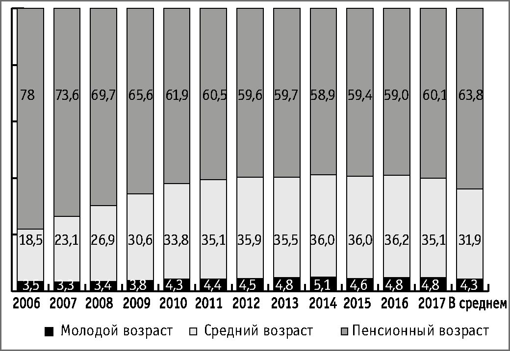 Наиболее высокий уровень инвалидности отмечался у лиц среднего возраста, в среднем составил 72,6 на 10 тыс. соответствующего населения. За 12 лет отмечалось снижение уровня инвалидности во всех возрастных группах. В структуре по возрасту преобладали инвалиды пенсионного возраста, удельный вес которых за 2006–2017 гг. увеличился за счет инвалидов среднего и молодого возраста; в среднем составил 51,6%.