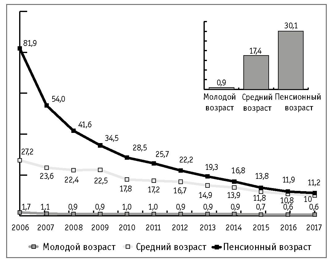 Анализ структуры первичной инвалидности по возрасту выявил преобладание инвалидов пенсионного возраста (в среднем 63,8%), которые продемонстрировали также наиболее высокий уровень инвалидности (в среднем 30,1 на 10 тыс. соответствующего населения). При этом наблюдаемое существенное уменьшение числа инвалидов пенсионного возраста – с 238,5 тыс. человек в 2006 г. до 41,1 тыс. человек в 2017 г. (показатель наглядности – всего 17,3%) – оказало влияние на динамику показателей, а именно отмечалось значительное снижение удельного веса и уровня инвалидности по сравнению с инвалидами других возрастных групп (рис. 2, 3).