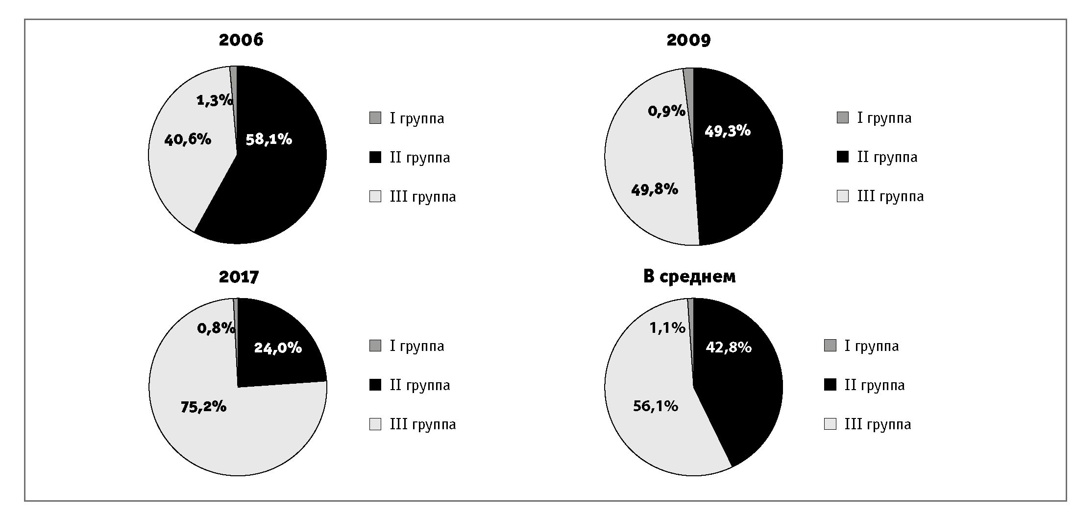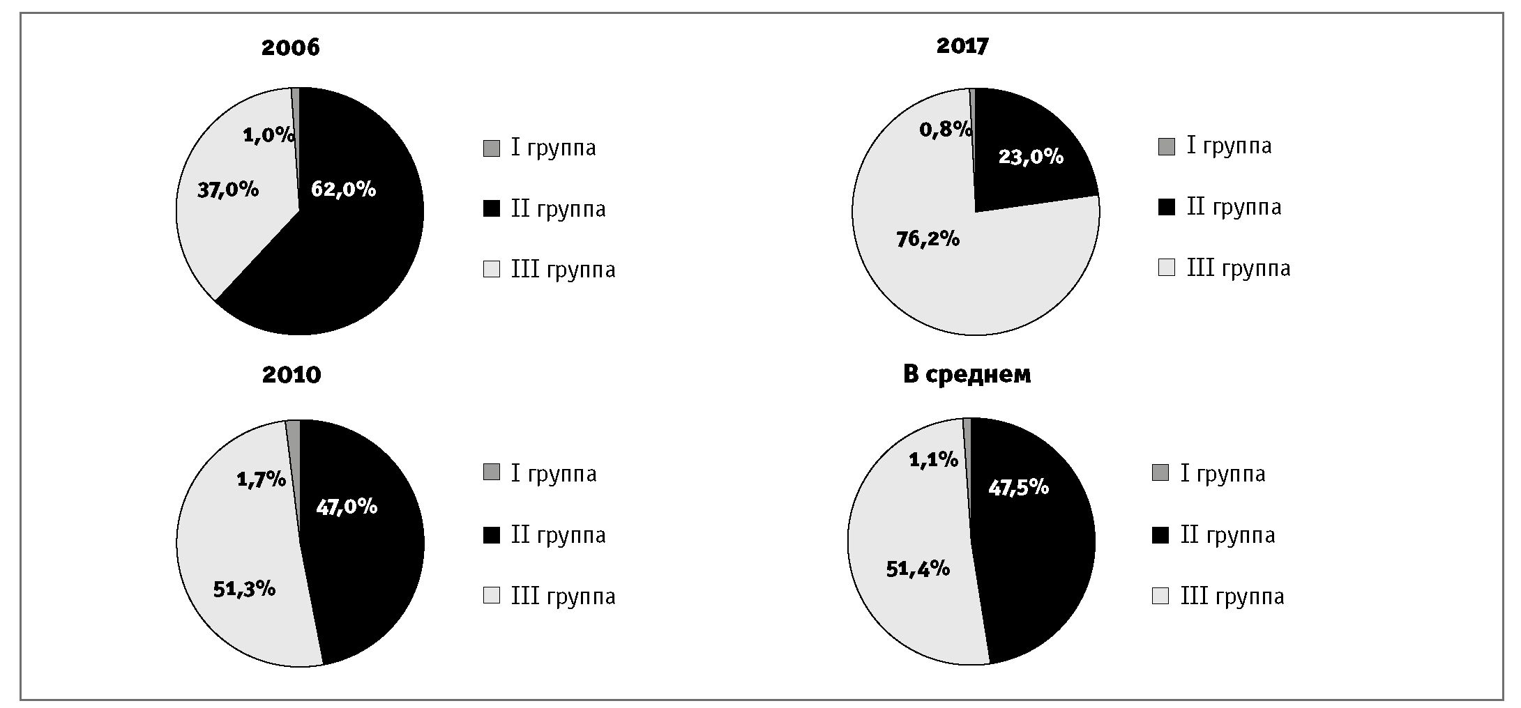 Рис. 4. Структура первичной инвалидности вследствие ИБС по группам инвалидности в динамике за 2006–2017 гг. (٪).