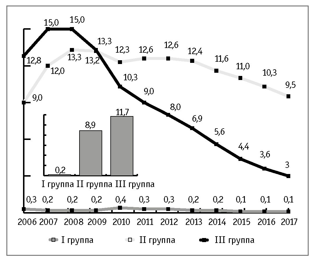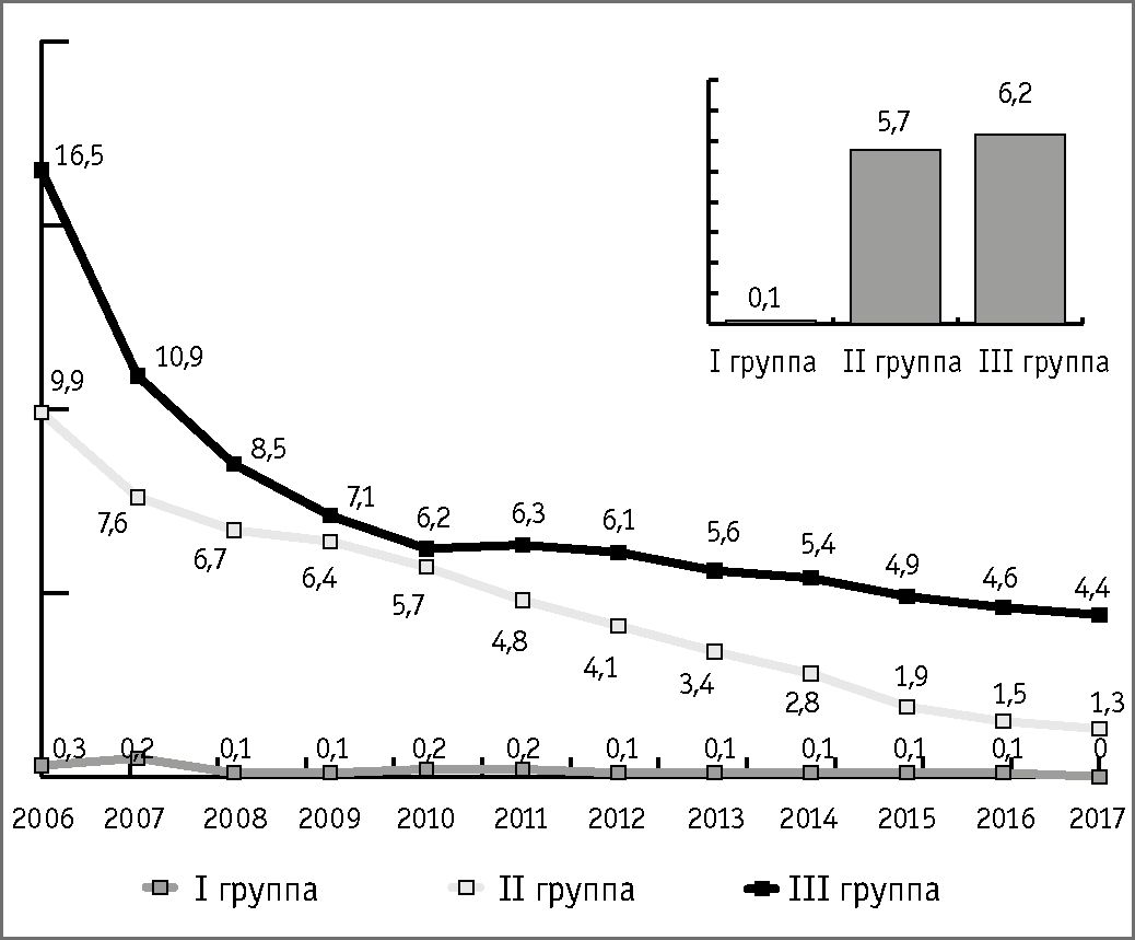 В структуре первичной инвалидности по группам инвалидности в 2006–2009 гг. преобладали инвалиды II группы, а в 2010–2017 гг. – инвалиды III группы; в среднем в год наиболее высокий удельный вес отмечался у инвалидов III группы (51,4%). В динамике за 12 лет доля инвалидов III группы увеличилась с 37,0% в 2006 г. до 76,2% в 2017 г., что связано со значительным снижением за 2006–2017 гг. общего числа инвалидов II группы (показатель наглядности – всего 8,0%). По этой же причине в 2006–2009 гг. был выше уровень инвалидности II группы, а в 2010–2017 гг. – III группы; в среднем в год наиболее высокий уровень инвалидности отмечался у инвалидов III группы – 6,2 на 10 тыс. взрослого населения (рис. 4, 5).