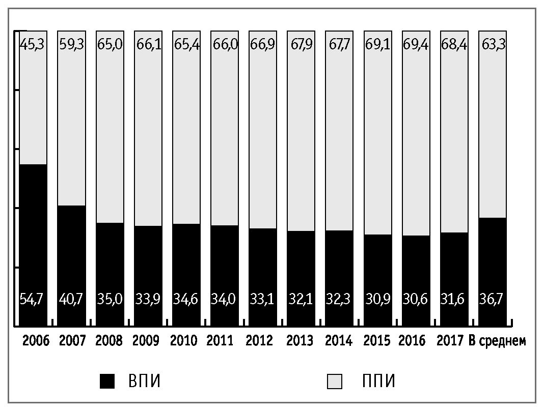 В контингенте ОИ во все годы исследования, кроме 2006 г., преобладали ППИ, доля которых постоянно увеличивалась с 45,3% в 2006 г. до 68,4% в 2017 г. Удельный вес ВПИ постоянно уменьшался с 54,7% в 2006 г. до 31,6% в 2017 г., в связи с чем начиная с 2009 г. не менее 2/3 структуры были представле- ны ППИ (рис. 11).