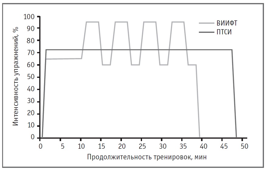 В клинической практике зарекомендовал себя режим интервальных тренировок с длительностью нагрузки 30 с и последующей фазой отдыха 60 с. Рекомендуется интенсивность нагрузочной фазы 50% от максимальной ЧСС при специфическом быстром рамп-тесте (рис. 1) [10].