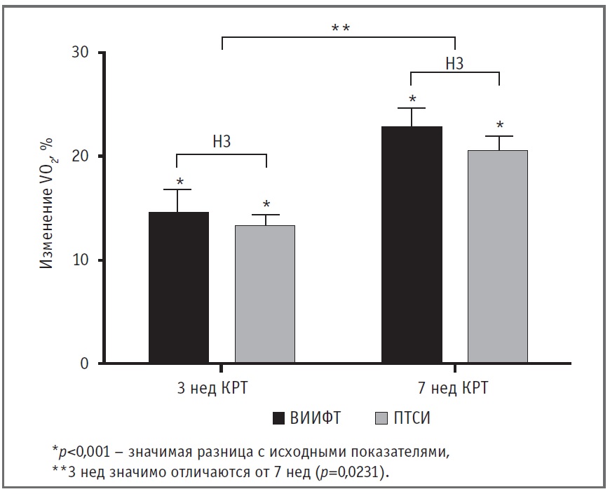 В нашем исследовании, так же как и в ранее выполненных клинических исследованиях [19], у больных после АКШ достоверно улучшались показатели эргоспирометрического теста и некоторые ЭхоКГ-параметры после 3-недельного и 7-недельного цикла аэробных КРТ, при этом в большей степени в группе ВИИФТ, чем в группе ПТСИ. Это были показатели VO2max, ЧСС, мощности нагрузки, КДО и ФВ ЛЖ. Также достоверно снижались МТ и ИМТ пациентов к концу 7-недельного цикла КРТ, в большей степени в группе ВИИФТ. В целом малопримечательна разница в динамике восстановления пациентов на фоне аэробных КРТ в группах АКШ с ИК и без него. Незначимое, но более медленное восстановление происходило в группе АКШ с ИК, чем без ИК.