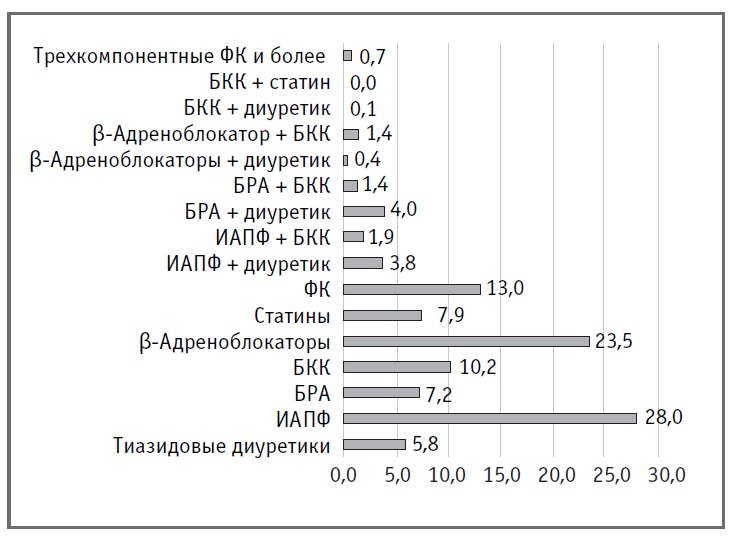 Тенденции последних лет заключаются в расширенном применении ФК как наиболее эффективных для коррекции артериального давления и в использовании статинов – плейотропных препаратов с основным холестеринснижающим действием у пациентов с высоким риском сердечно-сосудистых осложнений независимо от наличия АГ. Актуальность такого подхода обоснована значительным вкладом АГ и гиперхолестеринемии в развитие инфарктов миокарда и инсультов – основных причин смертности в РФ и мире [9] и связанных с ними социальными и экономическими потерями. Достаточно сказать, что распространенность АГ в РФ среди взрослого населения составляет не менее 45% и требует у большинства пациентов долговременного приема препаратов. Жесткий подход к контролю артериального давления стал лейтмотивом современных клинических рекомендаций [10], что несомненно значительно увеличивает потребность в использовании ФК уже на старте терапии.