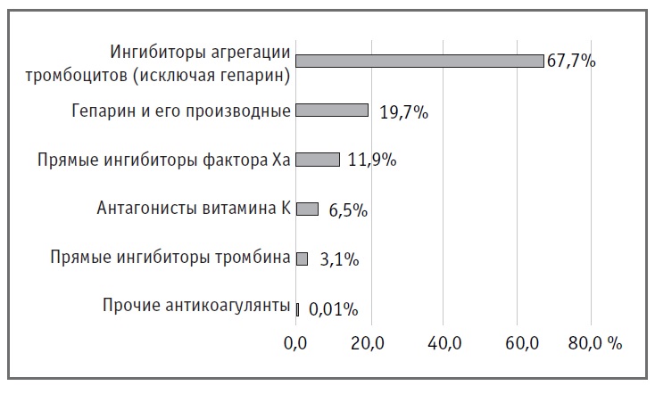 Рис. 4. Средние доли объема реализованного спроса антикоагулянтных и антиагрегантных ЛП в 2015–2020 гг. / Fig. 4. Average shares of sales volume of anticoagulant and antiaggregant drugs in 2015–2020.
