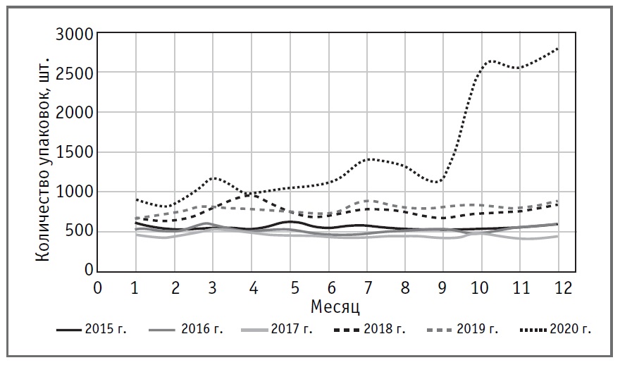 При анализе реализации ЛП по месяцам отмечается существенный рост потребления антитромботических препаратов в конце 2020 г. (октябрь–декабрь), превышающий соответствующие значения в 2015–2019 гг., что совпадает с ростом заболеваемости COVID-19 в Самарской области (рис. 5).