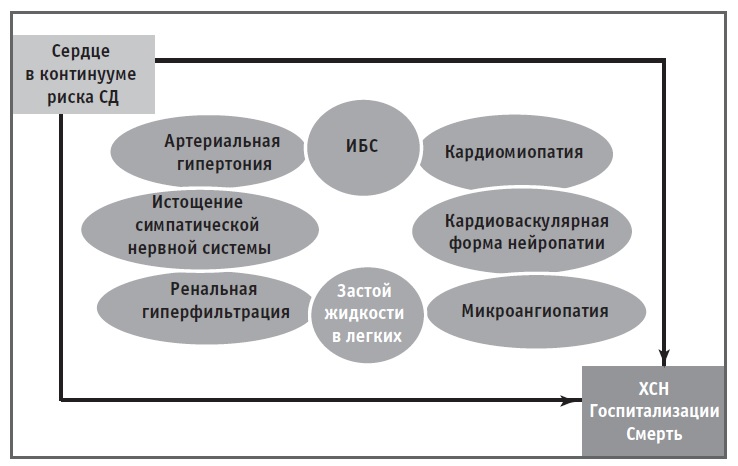 В международных рандомизированных клинических исследованиях (РКИ), начиная с UKPDS, у пациентов с СД так же, как и в общей популяции, свою эффективность в предупреждении сердечно-сосудистых осложнений доказали статины, β-адреноблокаторы, блокаторы ренин-ангиотензин-альдостероновой системы, антитромботические препараты [8, 9]. После того как показали, что эналаприл уменьшает риск смерти у больных с ХСН, ингибиторы ангиотензинпревращающего фермента стали обязательным компонентом в лечении таких пациентов [10]. За последние годы в кардиологии появились новые стратегии лечения тяжелых форм ХСН – лечение ингибитором ангиотензиновых рецепторов и неприлизином, имплантация трехкамерного кардиовертера дефибриллятора (CRT D). Прогноз жизни таких больных зависит от наличия и степени снижения систолической функции ЛЖ: пациенты со сниженной фракцией выброса (ФВ) ЛЖ в большинстве случаев имеют тяжелые заболевания, ассоциированные с атеросклерозом [5]. Доказано, что реваскуляризация миокарда уменьшает сердечно-сосудистую смертность независимо от наличия или отсутствия СД [5]. В то же время у больных СД ХСН может быть не только ишемического генеза. На развитие тяжелой ХСН при СД влияют такие факторы, как кардиоваскулярная форма автономной нейропатии, специфическое поражение кардиомиоцитов, глюкозотоксичность и оксидативный стресс, формирующийся интерстициальный фиброз [11]. За счет формирования микроангиопатии коронарный резерв драматично снижается. ХСН при СД называют «зловещим октетом» (рис. 1).