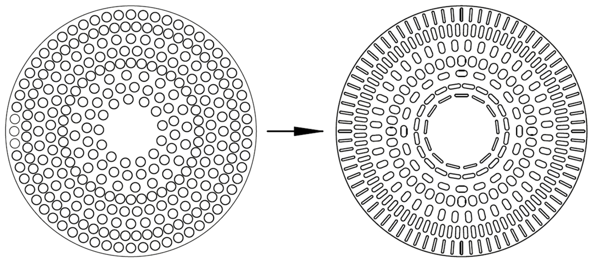 Этому принципу оптимизации формирования проходного сечения по пару, обеспечивающего максимальную эффективность тепломассообмена, соответствует трубный пучок треугольной формы (рис. 1) [2]. Однако данное техническое решение не вписывается в общепринятые формы корпусов и водяных камер, что существенно затрудняет реализацию преимущества интенсификации процесса теплообмена для улучшения массогабаритных характеристик по сравнению с трубными пучками цилиндрической формы.