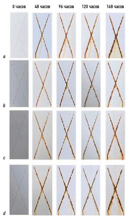 Рис. 2. Фотографии образцов (a) EP, (b) Gr 0,0125 % /EP, (c) Gr 0,025 % /EP и (d) Gr 0,05 % /EP при испытании в солевом тумане в течение разных часов.