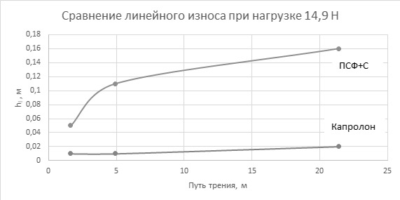 Капролон в данном эксперименте сохраняет постоянным значение линейного износа (максимальное значение, достигнутое при нагрузке 14,9Н.