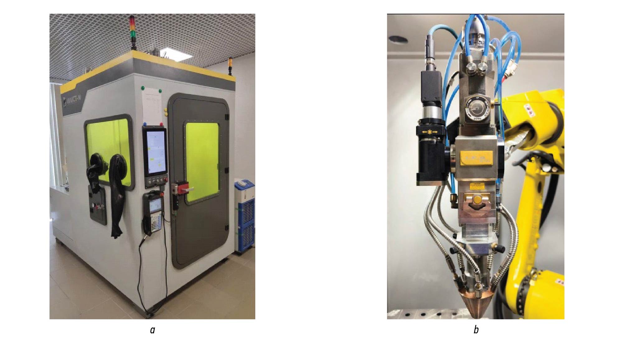 Для восстановления изношенных рабочих лопаток газотурбинного двигателя использовалась установка прямого лазерного выращивания ИЛИСТ-М, представленная на рис. 3, a. Комплекс представляет собой герметичную кабину, в которой расположен одноосевой позиционер и шестиосевой промышленный робот Fanuc M10iD/12. Робот оснащен лазерной головкой (рис. 3, b), в качестве источника излучения используется встраиваемый иттербиевый волоконный лазер IPG YLR-1500-U.