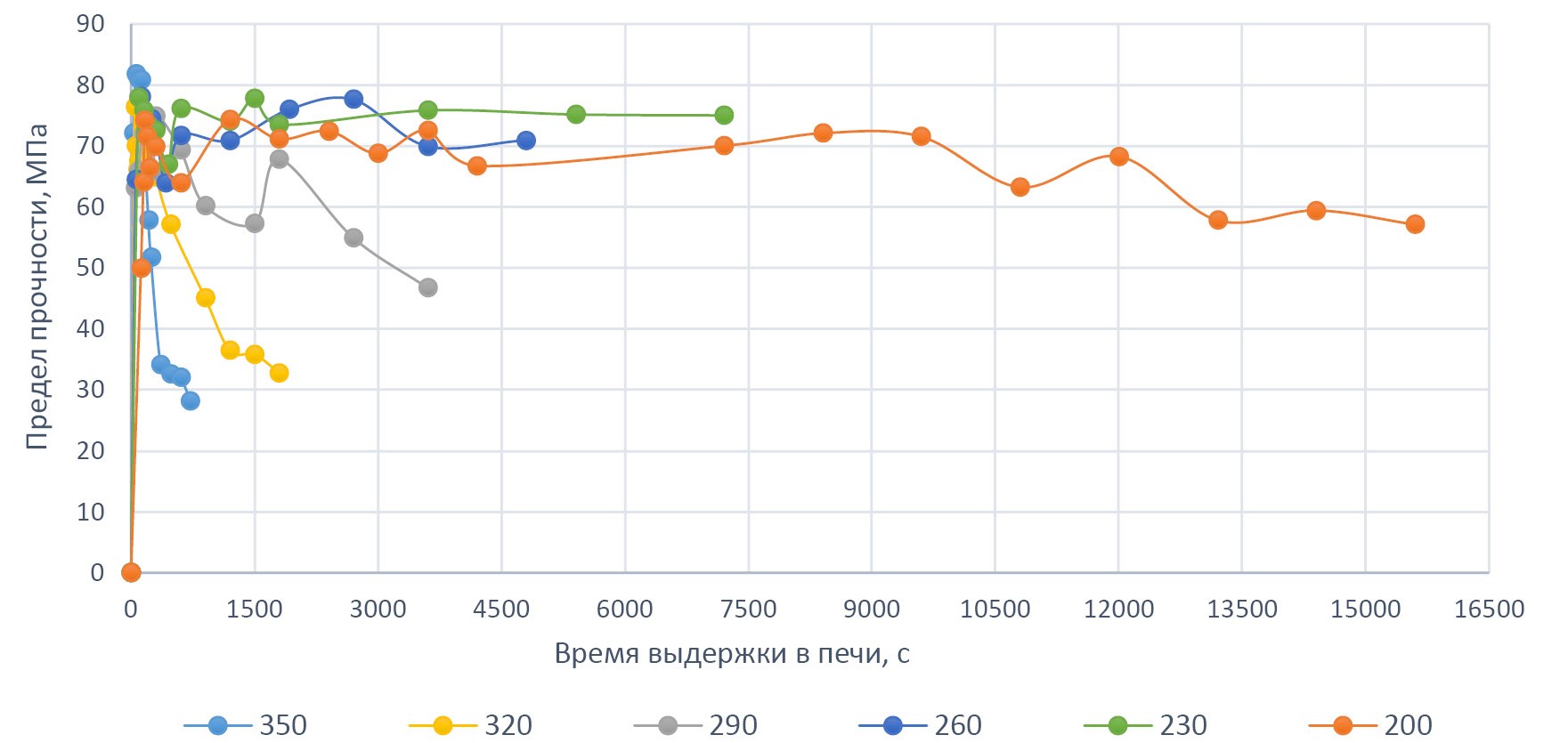 Численные значения роста и падения прочности, полученные в результате опытов, сделали возможным построение графиков зависимости прочности полимера при различных температурах оплавления порошка ПА 6/66-3 в зависимости от времени выдержки в печи представлены на рис. 2.