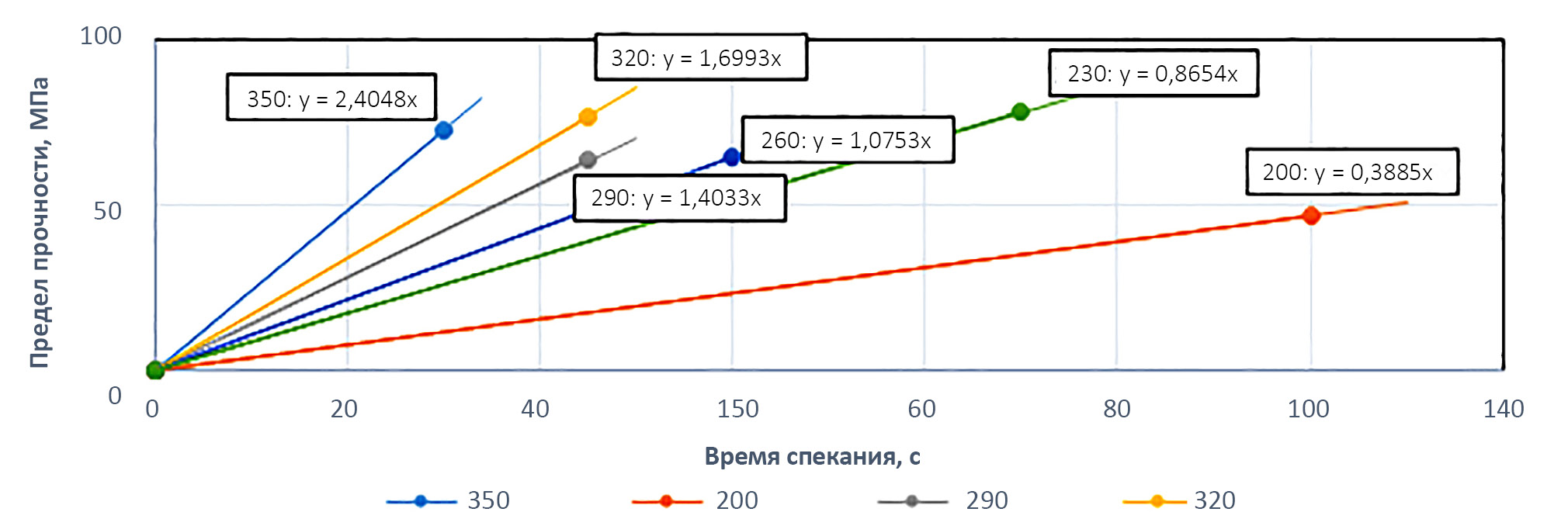 Таким образом, оказалось, что скорость роста прочности имеет линейную зависимость от температуры оплавления.
