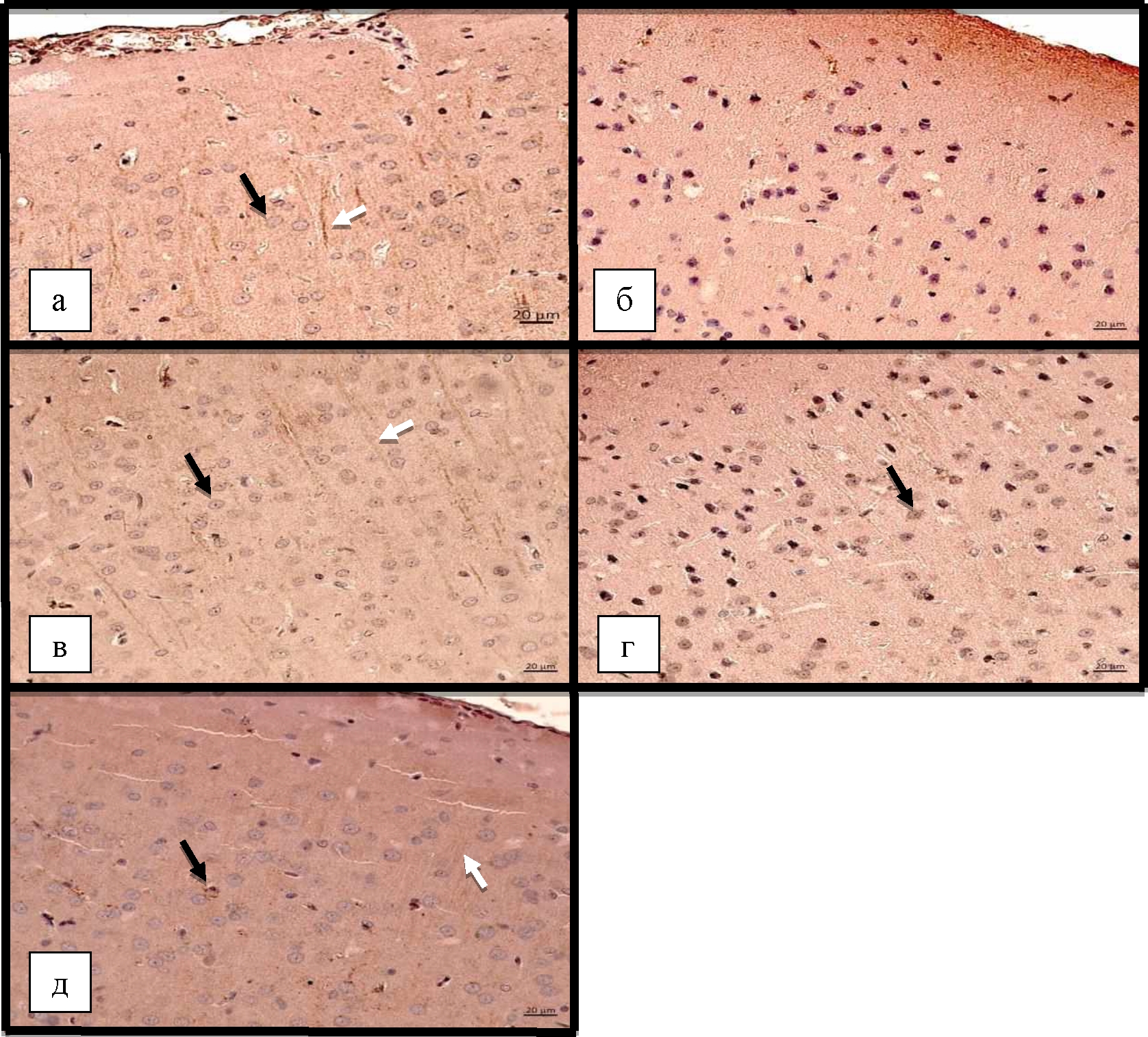 Рис. 1. Снижение экспрессии Nf-kb в наружном зернистом, наружном пирамидном слоях моторной коры при экспериментальной диабетической энцефалопатии: а – интакт-экспрессия ИРМ в цитоплазме перикарионов, в вертикальных отростках нейронов; б – СД I типа без лечения – макрофаг с экспрессией ИРМ; в – аминалон – наличие ИРМ в цитоплазме перикарионов и в вертикальных отростках нейронов; г – мефаргин – наличие ИРМ в поврежденных ядрах нейронов; д – сукцикард – наличие ИРМ в цитоплазме неповрежденных нейронов, в ядрах поврежденных нейронов. Иммуногистохимическое исследование, антитела против Nf-kb, докраска гематоксилином. Увеличение ×400. Черные стрелки – экспрессия ИРМ в нейронах. Белые стрелки – экспрессия ИРМ в вертикальных отростках нейронов