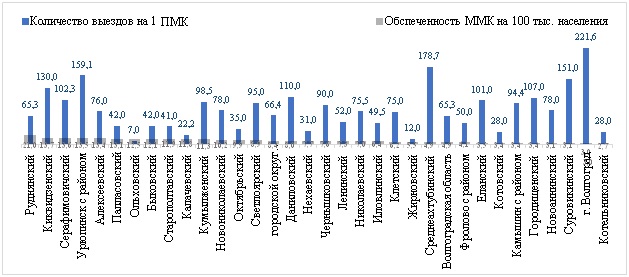 Вместе с тем при сопоставлении показателя обеспеченности передвижными подразделениями и количества выездов на 1 передвижной мобильный комплекс по муниципальным образованиям Волгоградской области наблюдается отсутствие корреляции данных между данными показателями. В какой-то степени это связано с увеличением нагрузки на ПМК в городской местности в условиях небольших расстояний и компактного проживания городского населения на данной местности.