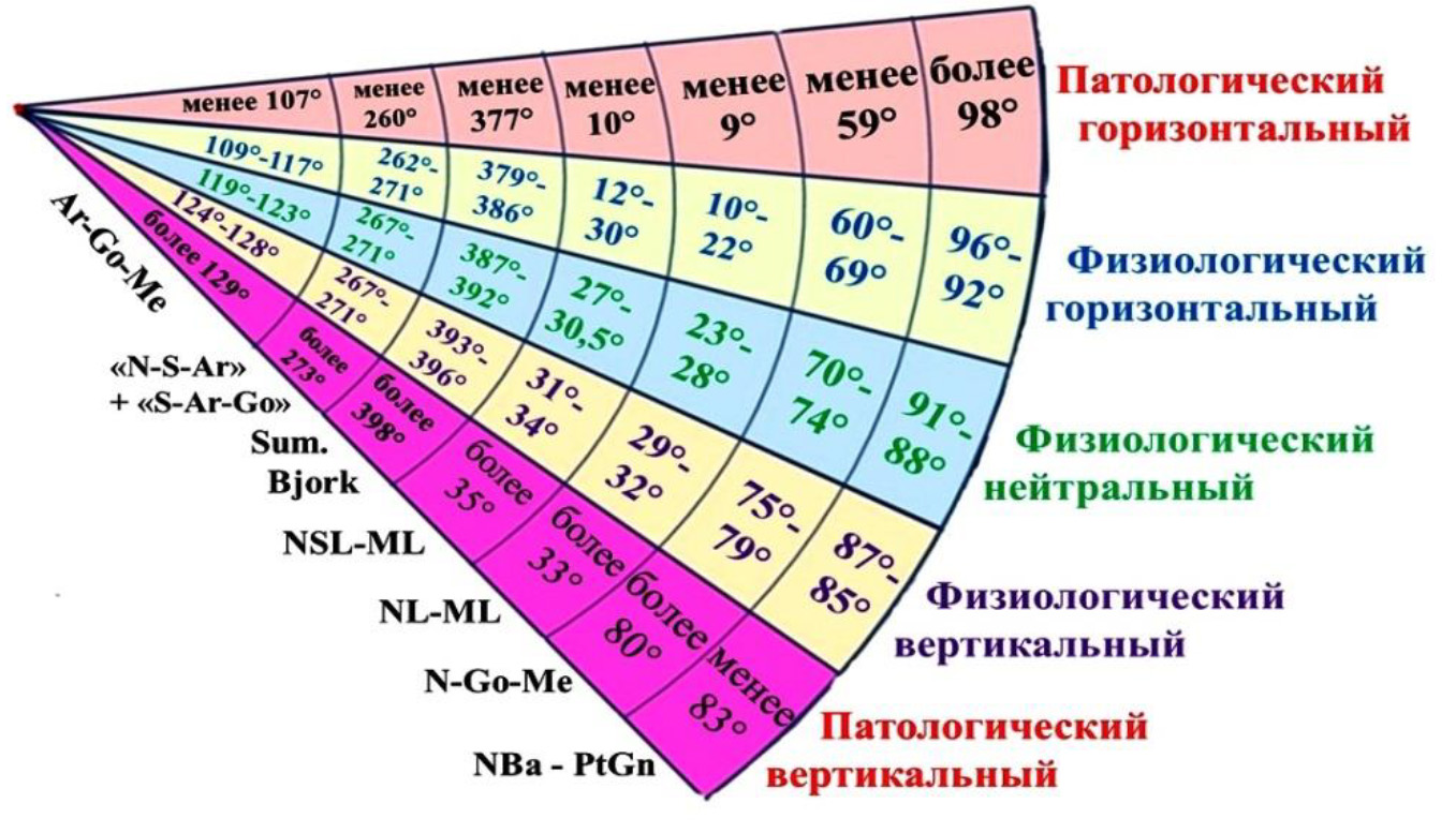 В учебниках приводятся закономерности развития черепно-лицевого комплекса и показаны основные методы определения типов роста лица, включающие анализ угловых параметров. Для практических целей представлена секторная диаграмма с цифровым диапазоном значений, характеризующих нейтральный, горизонтальный и вертикальный тип роста лица.