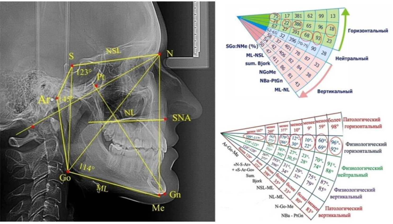 Сравнительный анализ традиционного анализа типов роста лица с предложенными поправками провели при анализе рентгенограмм с различными типами нижнечелюстного угла.