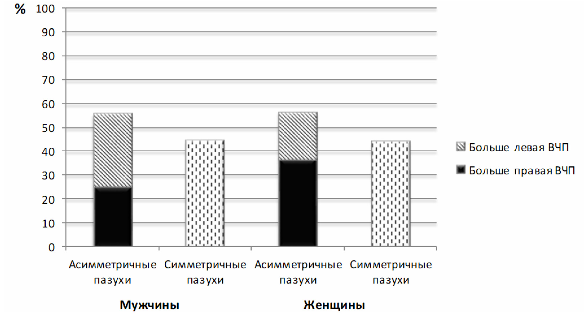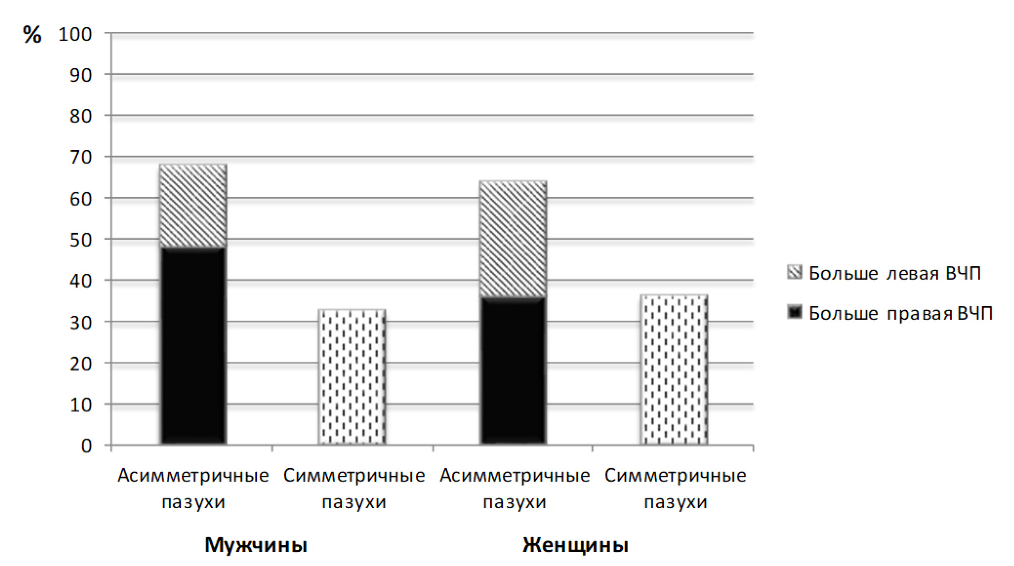 Следовательно, при МФЛЧ как у мужчин, так и у женщин черепа с асимметричными верхнечелюстными пазухами встречаются в 1,3 раза чаще, чем с симметричными синусами. Среди объектов с асимметричными гайморовыми пазухами у мужчин превалируют черепа с большим левым синусом, тогда как у лиц женского пола в данном случае преобладают черепа с большей правосторонней пазухой.