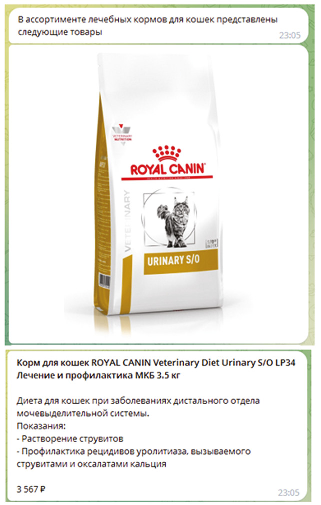 На рис. 3 приведен результат нажатия кнопки «Лечебный корм», представляющий собой данные о доступных вариантах кормов с описанием, фото и ценой.