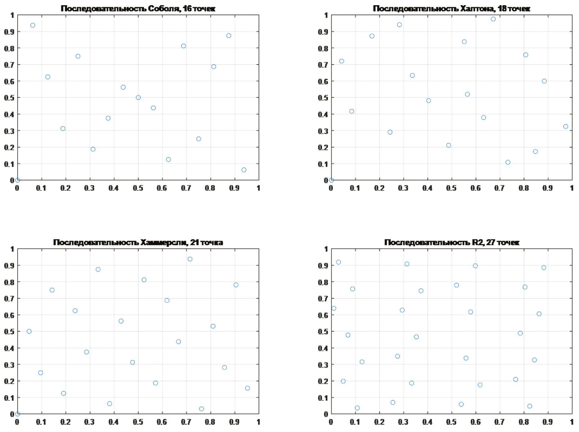 Методы. Рассматривался диапазон от 3 до 30 точек, где при каждом формировании набора высчитывались три критерия качества: коэффициент корреляции, функция размаха и незаполненность ПЭ. Последняя величина выражается как единица минус отношение площади образованного точками выпуклого многоугольника к общей площади. Хорошими будем считать следующие диапазоны критериев: 0–0,15 по корреляции и незаполненности, 0–0,2 — по функции размаха; допустимыми: 0,15–0,3 по корреляции и незаполненности, 0,2–0,4 — по функции размаха. Более высокие значения критериев считаются недопустимыми. Были исследованы четыре метода создания последовательностей: Соболя, Халтона, Хаммерсли и R2.