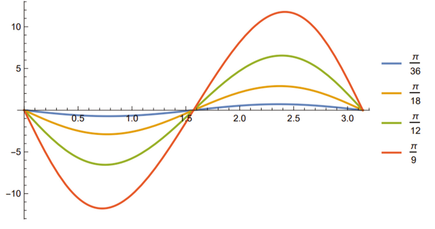 Для представления, как изменяется угловая скорость ведомого вала ω2 в зависимости от угла α поворота ведущего вала при различных значениях угла наклона валов, изображен график, построенный для углов γ, равных 5° (π/36), 10° (π/18), 15° (π/12) и 20° (π/9). Угловая скорость ведущего вала ω1 = π30.