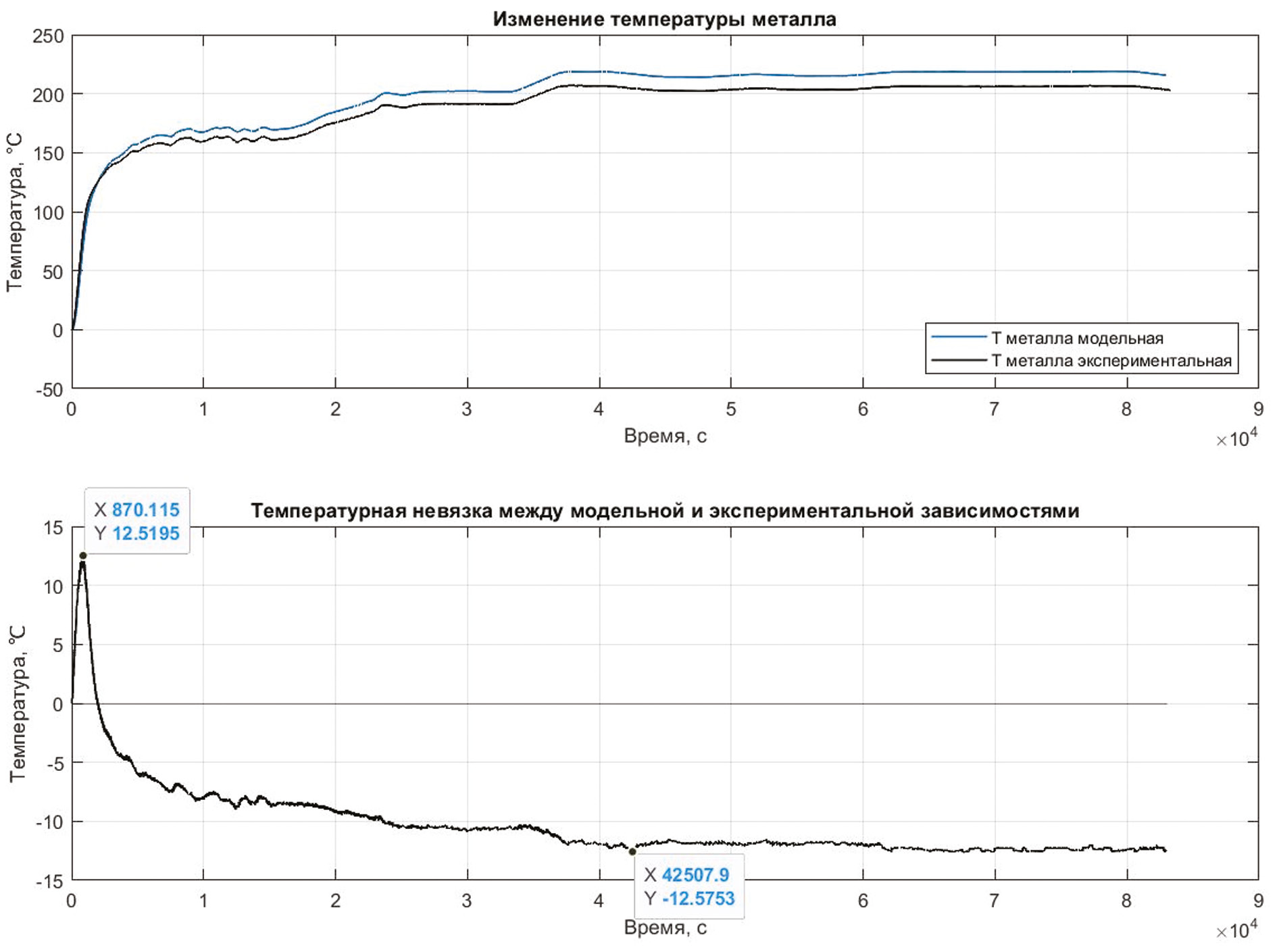 Согласно проведенной идентификации коэффициент конвективного теплообмена равен α = 620 Вт/(м2 · К) (рис. 2).